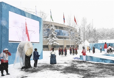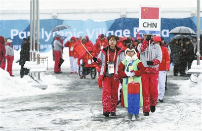3月8日,2018年平昌冬残奥会中国体育代表团升旗仪式在平昌运动员村举行。 图为升旗仪式现场。