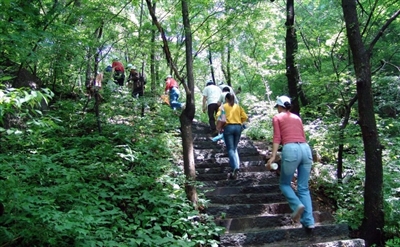 爬山之前需要做好准备活动,以免受伤。按照从上到下的顺序,采用转、揉、拍、抖、踢、压等方式活动全身的关节,时间大约为10分钟,让肌肉和组织的温度提高,这样才能起到热身的作用。
