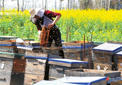 12日,咸安区双溪桥镇万亩油菜花竞相绽放,金灿灿的一片,吸引大批市民前来观赏,也吸引自来省内外的养蜂人到此放蜂采蜜。来自安徽黄山的养蜂人吴耀华说,每年油菜花开的时候他都要过来放蜂一个月,今年带来了230多箱蜜蜂。