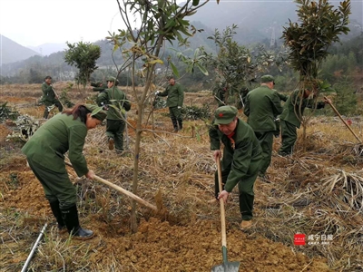 8日,春风和煦,通山县大畈镇和平村碧波荡漾的富水湖畔,身着军装的老兵们正为新栽的枇杷树苗填土。