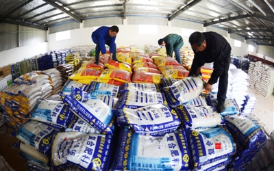 15日,咸安区丰顺农资市场里,工人们正在调运春耕化肥。