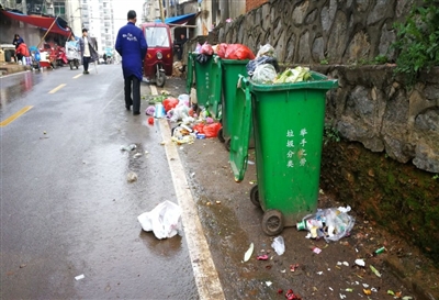 “最烦人的是餐饮垃圾。”负责沃尔玛一带保洁的环卫工人熊常教说,温泉第一街的夜宵摊点一般在凌晨以后收工,剩菜、一次性餐具扔得满地都是,每天要清运二三车。