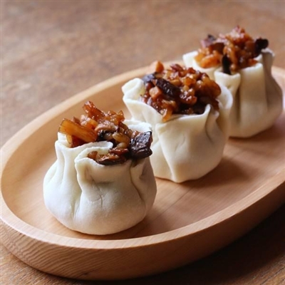 这几样准备好了,就把糯米、肉糜和香葱揉成一坨做馅。用面皮将馅包起来,最好让馅露出一点点,蒸熟后就会像一朵绽放的花。