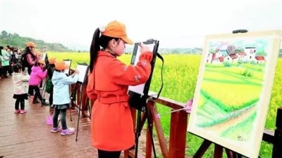 咸安区第三届探春赏花乡村游在马桥镇建国畈油菜花海拉开序幕。孩子们用笔勾画着春天的美景。