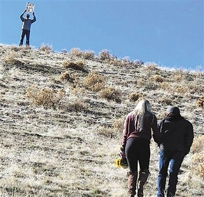 近日,美国内达华州温尼卡市的一名父亲在女儿答应男友求婚后,站在山顶举起自制的“别嫁”字牌,以这种搞笑的方式向他们表示祝福。
