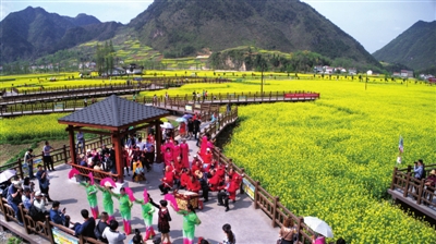 4月9日,汉中市勉县老年大学的学员们在唐家湾油菜花观光点为旅游者表演节目。