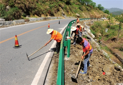 9日,通城县S259幕阜山旅游公路大埚段,县公路局养护人员在为公路安全生命防护工程做路肩修整。去年以来,全市交通公路部门在急弯、陡坡、临水、临崖、视距不良等路段,完成国省道“455”安全生命防护工程420公里,为交通出行安上一道“护身符”。