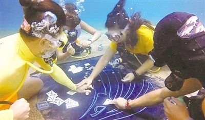 日前,埃及2名潜水员在达哈布阿卡巴湾潜水时见到一群带着面罩、潜入海底悠闲自得玩扑克的人,这让他们吃惊不已。当时,水底铺着一块垫子,这群人都戴着面罩,将自己的氧气罐放在一边,手里都握着扑克牌,将各自的钱放在垫子上,他们时而躺着,时而坐着,津津有味地玩着。据悉,这群人也是潜水爱好者,只不过他们这次潜水时却玩起了打扑克这个新花样。