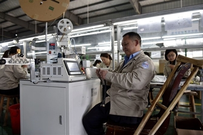28日,通城县湖北大阳电线电缆车间,员工们在组装电器配件线。
