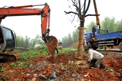 4月26日,赤壁市陆水湖办事处芳世湾村,工人正在种香樟树。