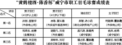 本报讯 记者贺春音、实习生蒋敦文、通讯员罗露报道:4月28日至29日,我市举行2018年职工羽毛球赛。经过两天的激烈比赛,来自市供电公司队的孙刚、袁敏华夺得40岁以上组男子双打冠军,来自市实验外国语学校队的林海、黄从春夺得40岁以下组男子双打冠军,来自市供电公司队的柯朝晖、瞿晓霞获得女子双打冠军,来自湖北众联房地产公司队的吴敏、汤小莉夺得混合双打冠军。