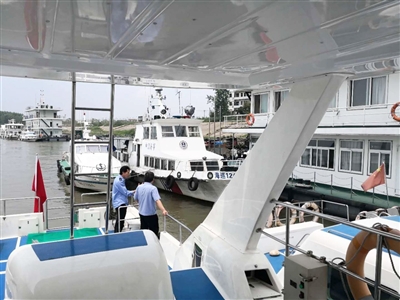 江面,嘉鱼县水政监察大队工作人员在巡查有无非法采砂作业。
