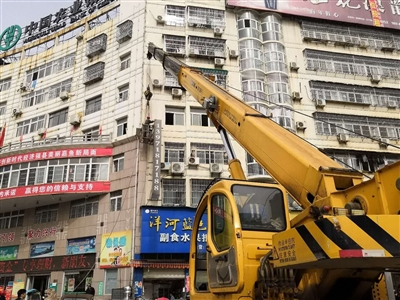 近日,鱼岳镇茶庵新转盘处农行门口,十几名新区城管执法队员正在这里拉警戒线、清理现场。随着围观群众被控制在警戒线以外,一辆吊车将2名工作人员吊到二楼广告牌处,进行拆除。据悉,该局此次将拆除35处广告牌。