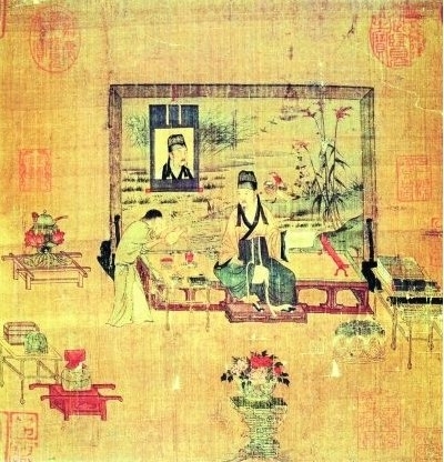 高濂这个书房的摆设确实高端大气上档次,但这非富贵之家不可为,古代一般人家的书房大多只是“一桌一椅一盏灯几架书而已”。在此之外,惟香炉、盆景、匾联三物最为古人看重。这从宋元以后的文人绘画中便可以看出,如现收藏于台北故宫博物院的南宋佚名绘画《人物图》,书房中的摆设就比较简单、清爽,最突出的,是前面居中的那盆鲜花,后面屏风上挂有自己的“写真照”。