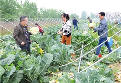 日前,咸安区双溪桥镇三桥村蔬菜基地,区委办驻村工作队队员在帮忙收割花菜。