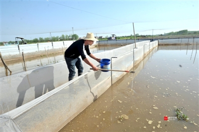 8日,嘉鱼县潘家湾镇潘湾村4组,村民张涛正在查看蛙苗长势。