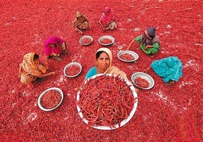 日前,摄影师AbdulMomin拍摄了孟加拉辣椒工厂工人晒辣椒的场景,图片中,鲜红的辣椒铺满地面,犹如大红色的地毯,壮观极了。