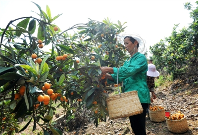 18日,嘉鱼县高铁岭镇嘉华果园公司,游客正在采摘枇杷。