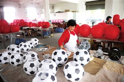 20日,崇阳县肖岭乡霞星村竹工艺公司员工在制作工艺足球灯笼。