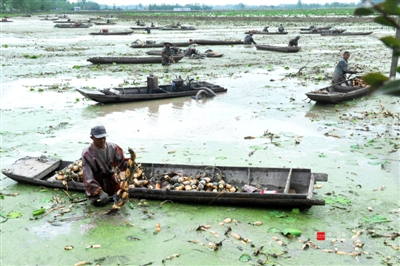 15日,嘉鱼县陆溪镇界石村鸿富莲藕基地,二十余条挖藕船分散田间,专业采藕工手持高压水枪,将一条条长长的莲藕冲浮出水面。该公司种植基地达2000亩,每年6月集中采莲藕,年生产加工莲藕3500余吨,产品出口至日本、新加坡等国,年产值超5000万元,并带动全镇310余户村民参与莲藕种植,人均增收8000元。