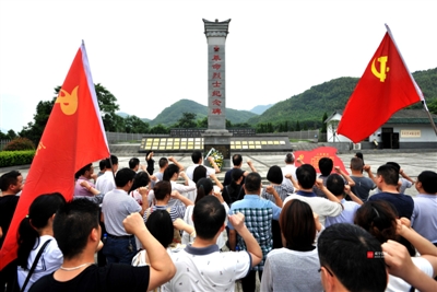 在羊楼洞烈士陵园,革命烈士纪念碑巍峨耸立,14.2米的高度象征着长眠于此的142名革命烈士。党员们肃立于纪念碑前,面对鲜红的党旗,重温入党誓词,聆听讲解员讲述革命先烈的丰功伟绩和烈士陵园的建设过程。全体党员向烈士们鞠躬默哀,并敬献花篮。