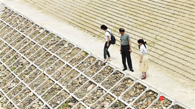 昨日,通城市民漫步在隽水河城区段河堤生态护坡上。