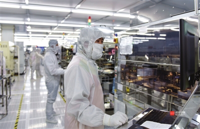 昨日,通城三赢兴电子科技有限公司无尘车间,技术人员通过电脑操控自动封装设备生产手机摄像模组。