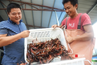 13日,赤壁市余家桥乡东港湖天然养殖基地农民在装运小龙虾,准备销往武汉等地。