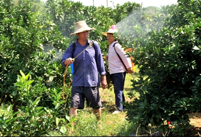 6月25日,嘉鱼县渡普镇王家庄村脐橙园,果农们正在为脐橙树喷施无残留低毒保果农药。