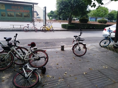 7月2日,记者在市体育中心路段看到,公交站台后方数辆单车杂乱倒在人行道上,还有多台单车随意停放在非机动车道,过往车辆须小心避开。