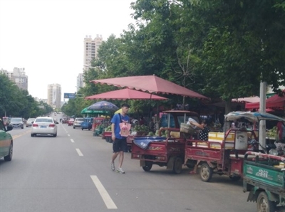 四车道的路面,一侧车道停放多辆三轮机动车,另一侧车道则停放多辆售卖瓜果车辆,仅有两条车道可供通行,这是记者在贺胜路杨下菜场路段所见。