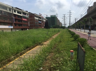 十六潭路璟湖世纪城至锦龙路路口,约一公里的路段,远看像郁郁葱葱的绿化带,走近一看,却是成片的杂草。一排还建房墙外张贴了各种各样的广告,无序杂乱。