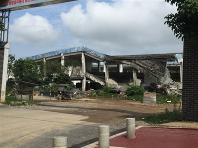 在市妇女儿童活动中心项目工地上,白色的围墙上大面积脱落的涂料,以及裸露的砖块显得非常刺眼,而且围墙多处出现裂缝,有垮塌的安全隐患。