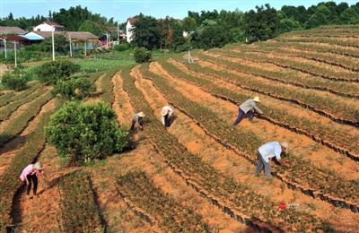 24日,赤壁市余家桥乡丛林村蓝莓苗圃园里,村民们正在园内除草。