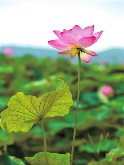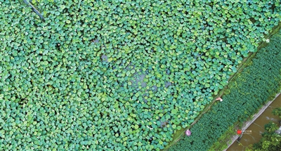 “青荷盖绿水,芙蓉披红鲜”。一片片形态各异、大小不一的碧绿荷叶,铺满水塘,或粉红、或粉白、或盛开、或半开的荷花,披着水珠,亭亭立于荷叶间,惹人怜爱。