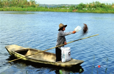 6日,赤壁市神山镇西湖村,上岸渔民陆长青的养殖基地里,养殖员正给龙虾喂食。
