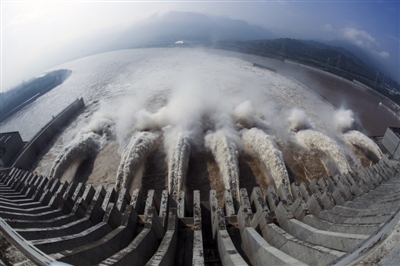 7月12日,三峡大坝开启6个泄洪深孔和1个排漂孔下泄上游来水。