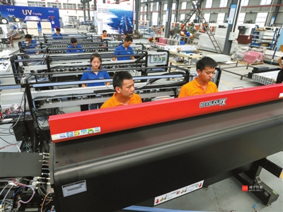 7月11日,咸安经济开发区湖北亿力高端打印设备制造有限公司内,技术人员正在装配首批下线的大型数码打印机。该公司于今年2月入驻咸安经济开发区,销量约占国内市场的30%,产品出口中东、东南亚等20多个国家和地区。