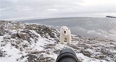 画面中,这只北极熊悠然踱步,探头探脑,仿佛要来检查照片拍得怎么样。