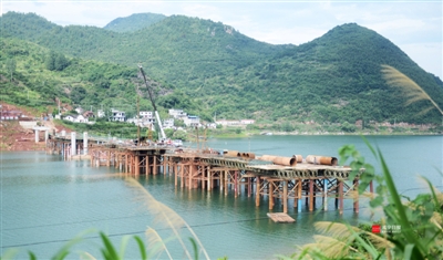 17日,通山县慈口狮岩大桥正加紧建设。该大桥位于慈口乡,总投资5000万元,连接慈口村和西垅村,全长380米,宽度12米,预计明年底建成通车。届时将解决当地群众行路难题,促进富水库区经济发展。