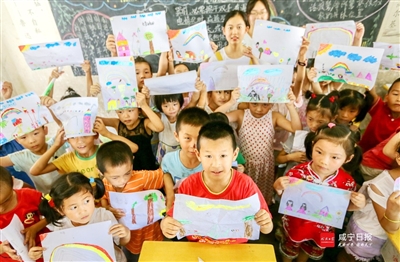 19日,官埠桥镇张公庙中小学“希望家园”内,孩子们正在展示志愿者老师辅导下作的画。来自湖北科技学院的9名志愿者除辅导暑期作业外,还教孩子们绘画、游戏、手工及安全知识等,报名参加的留守儿童达155名。