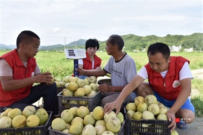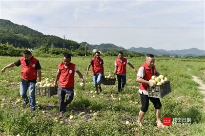 近日,在马港镇白竹村甜瓜基地,党员志愿者帮助瓜农采摘甜瓜,准备运往县城市场销售。