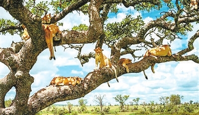 近日,以色列摄影师DavidChen在坦桑尼亚塞伦盖蒂平原游玩时邂逅了一个狮子大家庭,它们十分罕见的爬上了一棵大树,齐刷刷挂在枝头午睡小憩,好像树挂一样,轻松又惬意。
