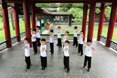 8月8日,孩子们在位于河北省承德市的避暑山庄内练习太极。 当日是全民健身日,各地举行丰富多彩的健身活动,倡导文明健康的生活方式。 据新华社