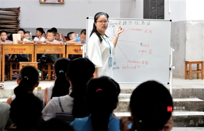 3日,崇阳县白霓镇大塘村,来自武昌理工学院的大学生正在给村里的孩子上英语课。据了解,暑期以来,共有70余名大学生深入该县白霓、石城、港口等7个乡镇18个教学点开展义务支教社会实践活动,丰富农村孩子的暑期生活,同时也带去了新的启发式教学理念,深受孩子们的喜爱。