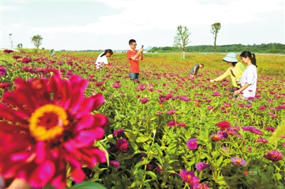 15日,嘉鱼县陆溪镇印山村的嘉鱼康丰源生态农业发展有限公司的花海吸引游客前来观看。
