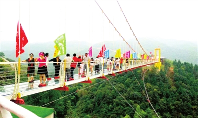 8月17日,农历七夕节。崇阳柃蜜小镇9D玻璃天桥正式开放。据悉,这是华中首座9D玻璃天桥,采用了超现实视觉9D技术和惊险刺激的特技效果。全长248米,海拔320米,可同时容纳500-800人。当日,吸引了上万名游客前来体验高空心跳的感觉。