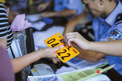 21日,市民在咸安交警大队青龙社区上牌服务点领取牌证。20日起,我市开始为符合政府公布目录内的两轮电动自行车登记上牌,旨在压降交通事故,加强电动车管理,更好地保护群众的生命财产安全。通讯员 吴涛 戴娟 摄