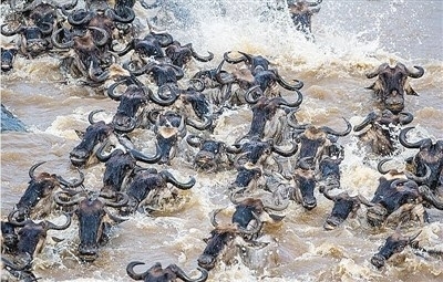 每年7—9月,非洲大陆上的角马、蹬羚、斑马等数百万食草动物为了寻找食物,都会从坦桑尼亚的塞伦盖蒂平原迁徙到肯尼亚境内的马赛马拉平原,而这需要经过两个多月长达1800英里(约2896千米)的艰苦旅程。在迁徙渡河的过程中,很多角马被碾碎、淹死或是成为鳄鱼的盘中餐。