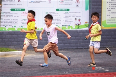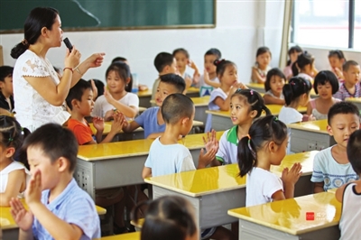 咸安区第十八小学的老师教学生们用拍手童谣学习文明礼仪。